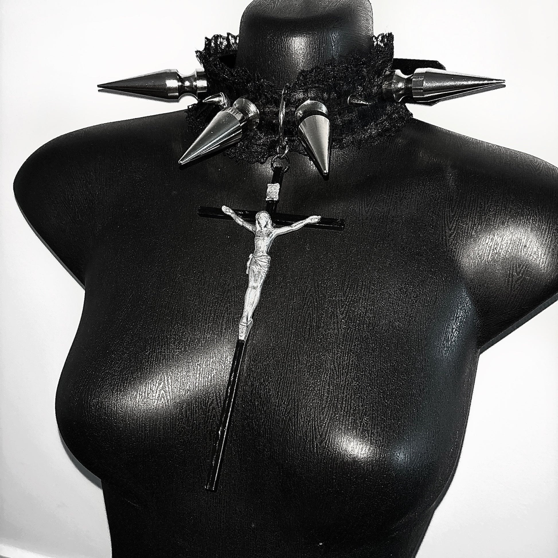 Feeling Unholy in this handmade spike choker perfect for a goth look! Made with recycled materials and a funeral crucifix which has been hand painted. This design is one of a kind and won’t ever be replicated!